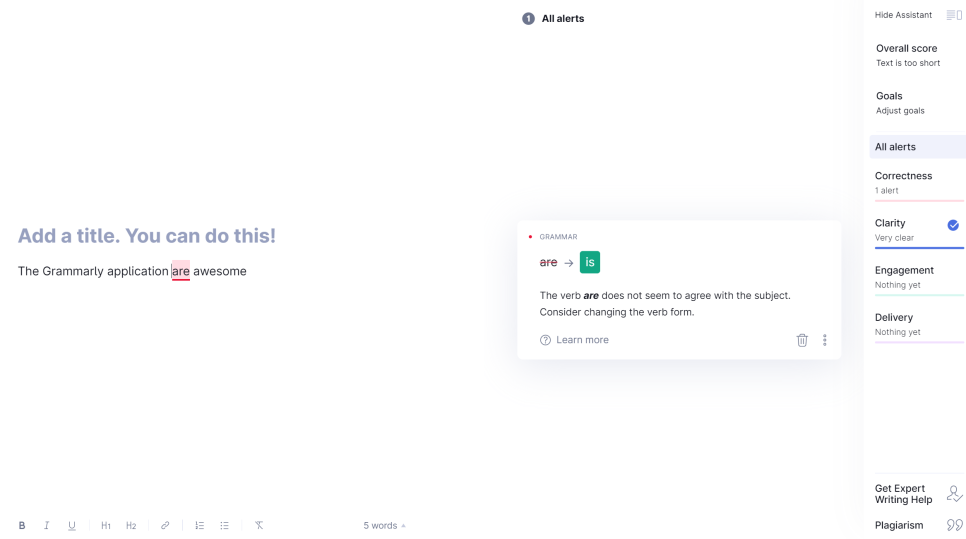 The Grammarly application are awesome -> are을 is로 바꾸라고 알려줍니다.