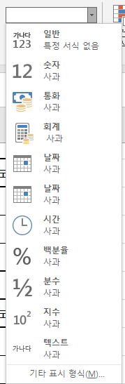 일반, 숫자, 통화, 회계, 날짜, 시간, 백분율, 분수,