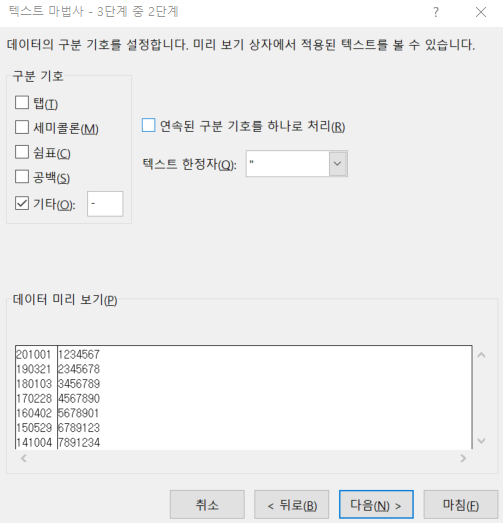 텍스트가 탭, 세미콜론, 쉼표, 공백, 기타(- , . * 등)
