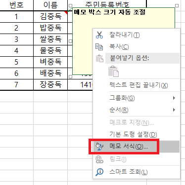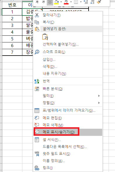 메모를 한 셀에 마우스 오른클릭을 한 후