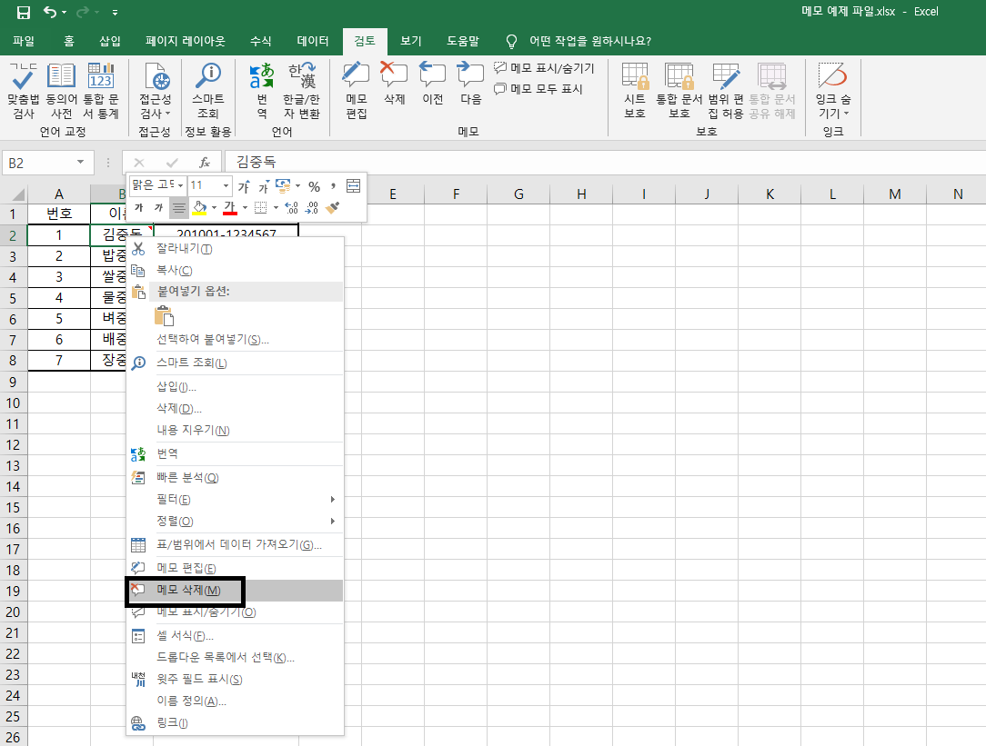 이렇게 엑셀에서 메모를 추가하고 삭제하는