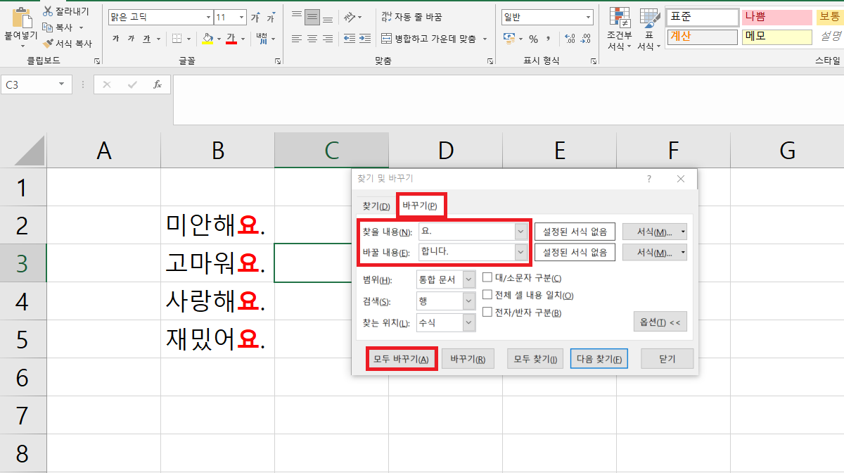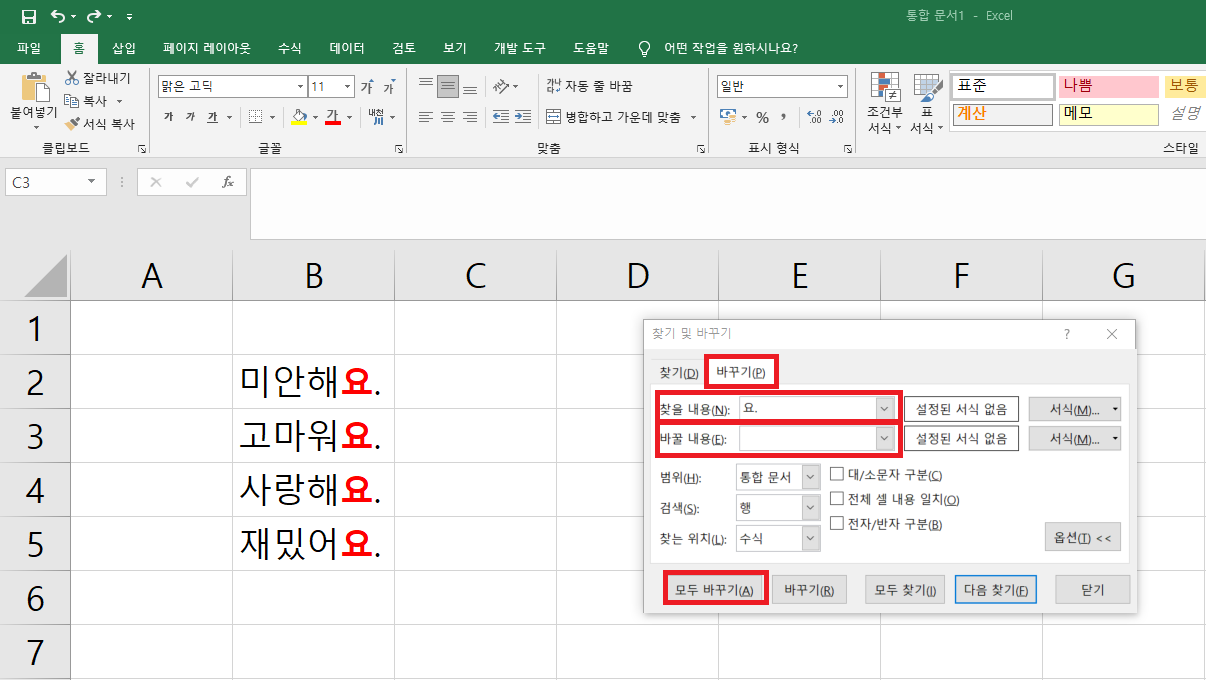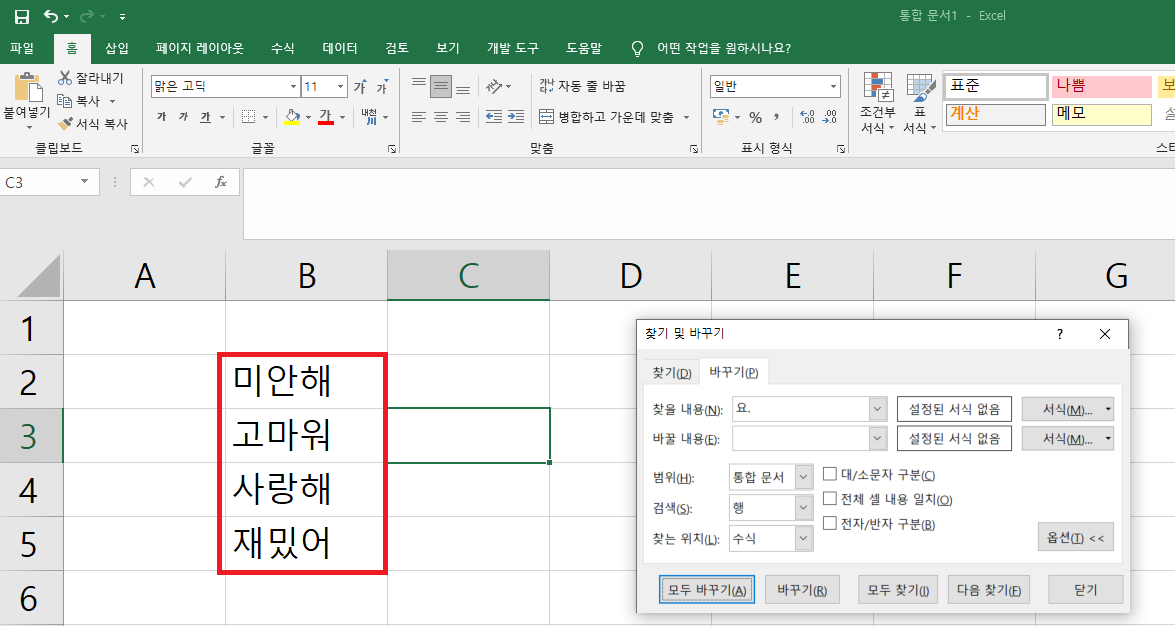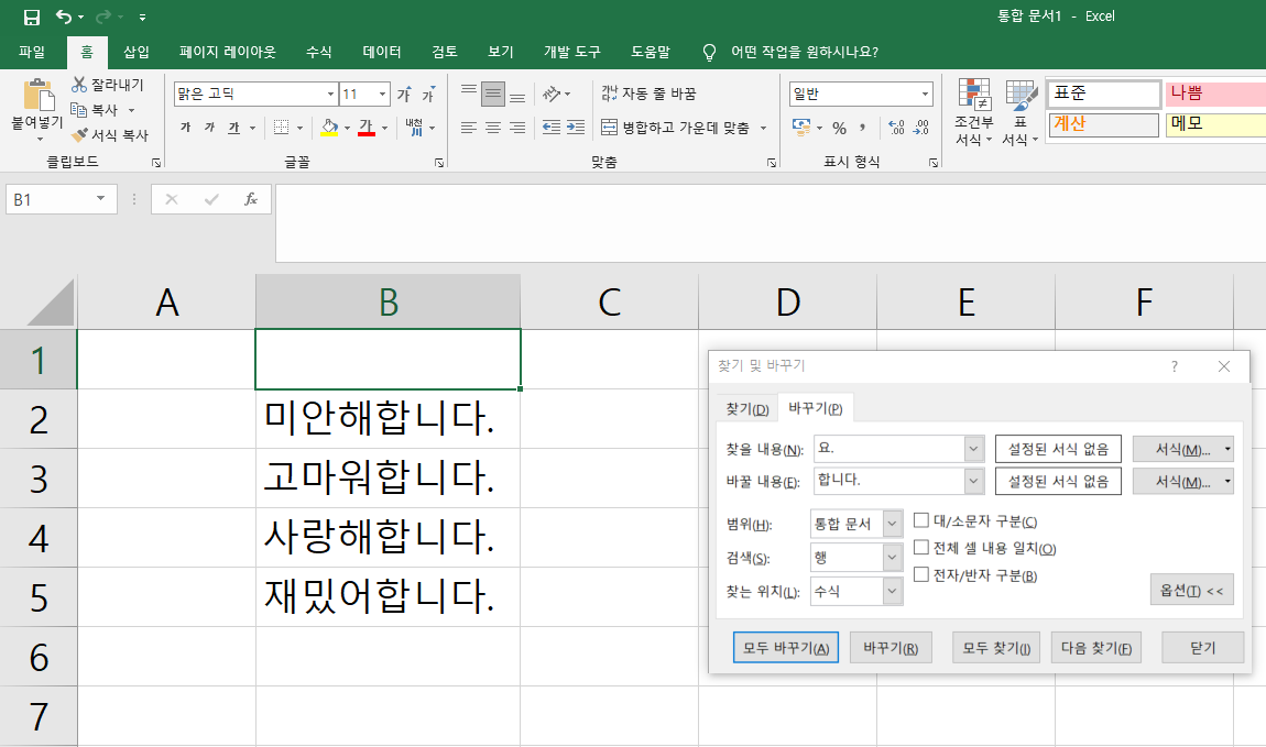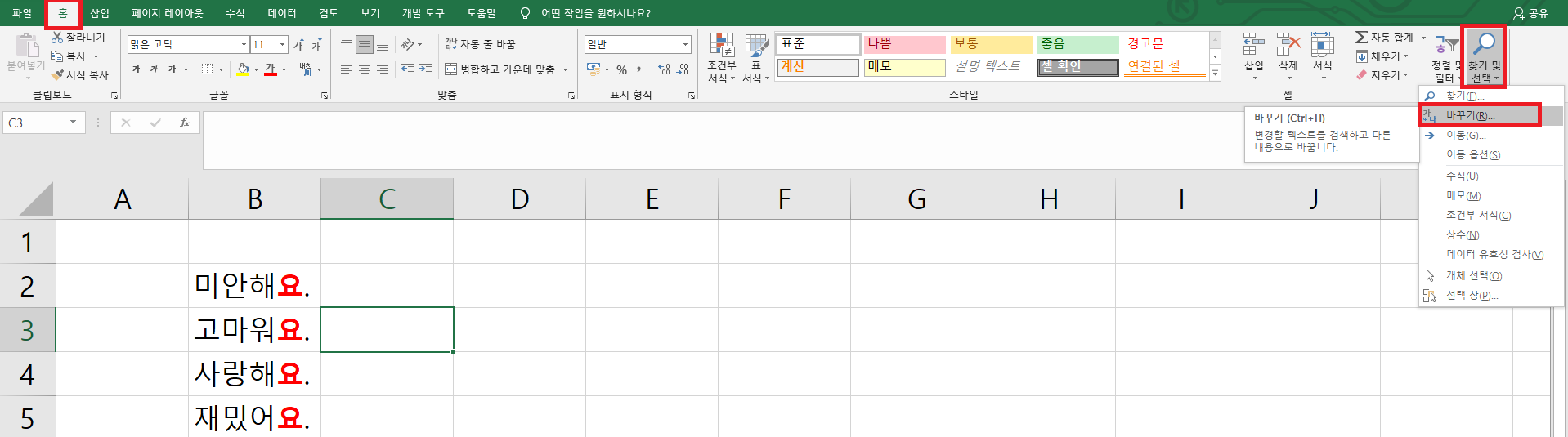 엑셀에 데이터를 입력하다보면 특정 문자나 단어를 바꾸거나 없애고 싶은 순간이 있습니다.