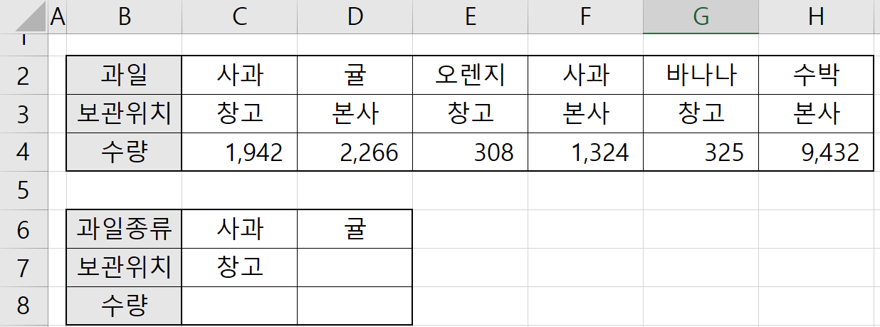 아래 예시와 같이 사과의 보관위치가 창고와 본사로 두군데에 있는데 HLOOKUP 함수를 실행한 셀의 값을 보면 창고(본사보다 왼쪽) 를 출력하고 있는 것을 알 수 있습니다.
