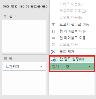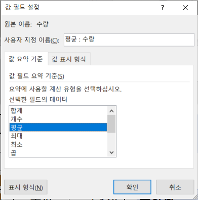 값 영역에 있는 "합계 : 수량"에 마우스 왼쪽클릭을 한 후