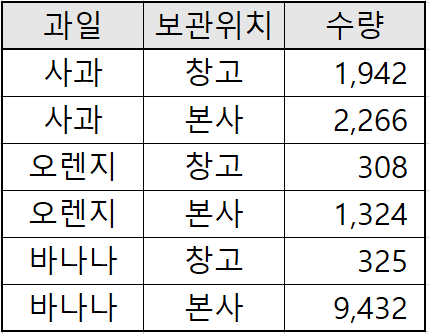 행 레이블은 과일(바나나, 사과, 오렌지)