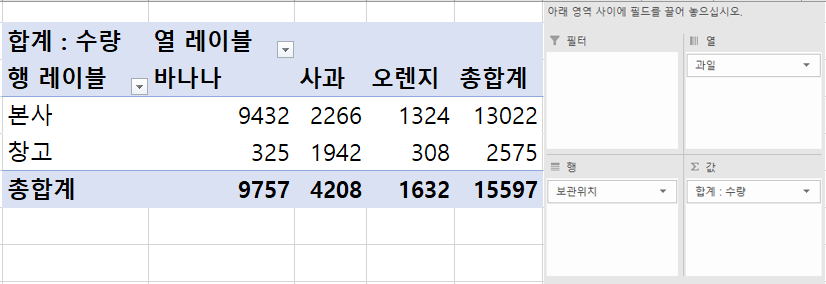 값은 수량 합계로 설정하여 피벗 테이블을 완성하였습니다.