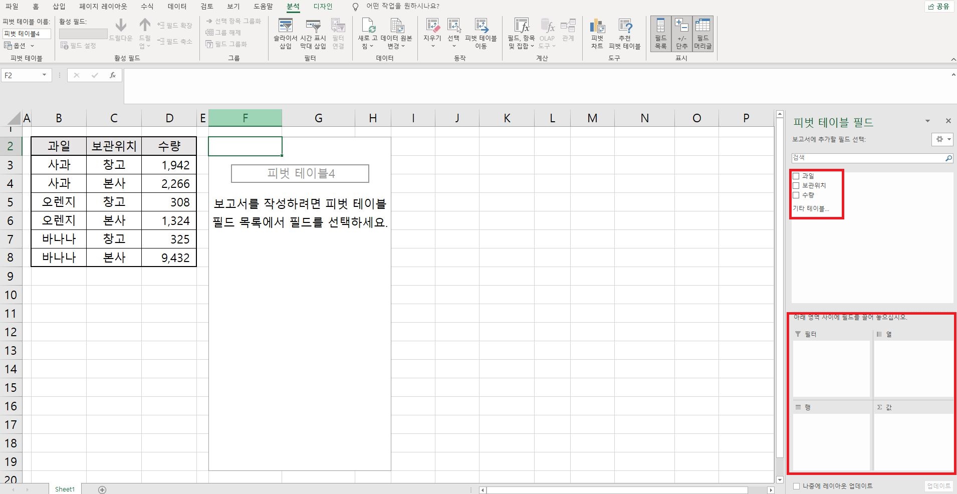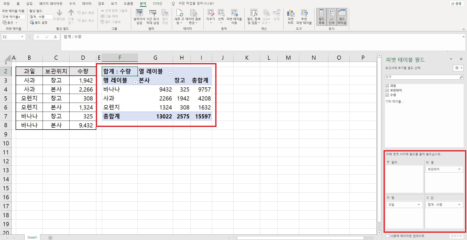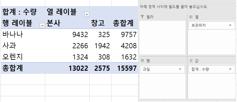 5. 본인의 목적에 맞게 필드를 이동시켜 피벗 테이블 완성
