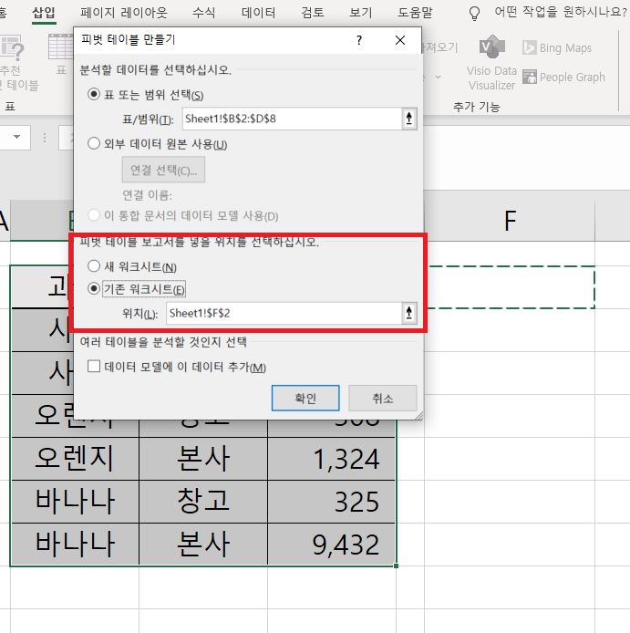 피벗 테이블 보고서를 생성할 위치를 선택합니다.