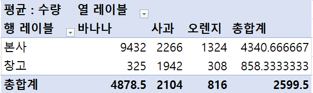 행 레이블은 과일(바나나, 사과, 오렌지)
