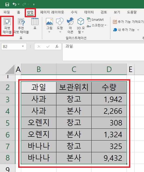 삽입 탭 -> 피벗테이블을 클릭합니다.